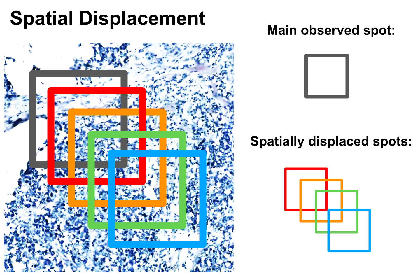 Displacement testing is used to evaluate how gene levels change when the image spot is displaced from where gene expression is experimentally measured. It is expected that as the displacement increases, the gene expression difference should become weaker in terms of cosine similarity correlation. Notice that from taking gradually increasing displacements, the cosine correlation can be seen to follow a similar trend (e.g. 0 pixel displacement vs 10,20,30 pixel displacements).